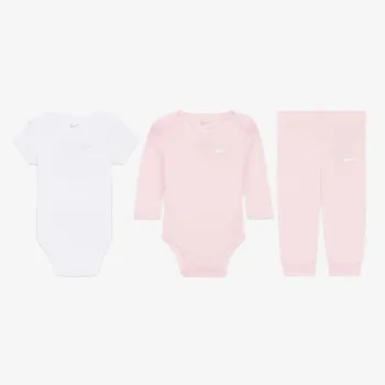 A Nike 3 részes alapszett puha, bordás kötésű pamut–poliészter darabjaival egész nap kényelmes, kíméletes viseletet nyújt a babának, és egyszerűvé teszi az átöltöztetést.